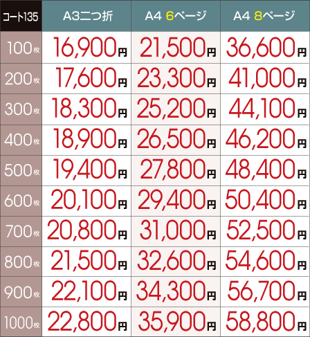 | パンフレット印刷料金は各媒体ごとに料金表をご用意しております。枚数ごとに料金が異なります。ご予算に合っているか必ずご確認ください。 |